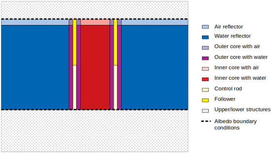 In the GeN-Foam SP model of CROCUS, two groups of cross-sections have been generated based on dedicated full core Serpent calculations [20], with the following homogenization regions: inner core, outer core, control rod, and reflector, as displayed in Figure 2. Each of these regions has been separated into a submerged and an emerged part. The lower and upper structures of the reactors were not considered in order to avoid the very sharp change in cross-sections occurring at their interface with the active core. A reduced geometry of the core was for this reason modeled, including only the structures placed axially in between the two cadmium layers, and proper albedo boundary conditions were set at the top and bottom boundaries. A gradual refinement of the mesh towards the cadmium layers was used in the axial direction, as shown in Figure 3c, allowing correct reproduction of the steep flux drop at boundaries.