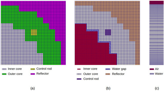 Top view of both the structured (a) and the unstructured (b) meshes with universe names. Only a reduced quarter of each is displayed to allow for a clear view of the boundaries between regions. The axial mesh refinement is also presented in panel (c).