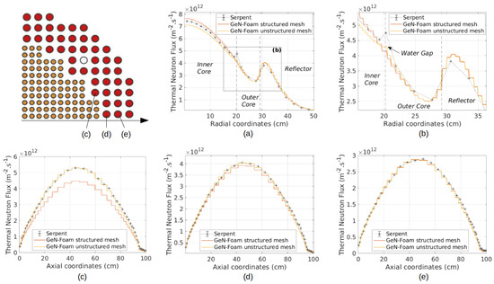 One can first notice in Figure 5a,b that the thermal neutron flux is higher in the inner core region for the structured model than for the unstructured one, even though the structured is lower than the unstructured. This is due to the inter-lattice water gap that is spread out in the inner core region for a model with a structured mesh. Therefore, in the process of generating the cross-sections, the cross-section of the inner core region has been homogenized by taking into account this extra slice of water, whose effect on neutron thermalization is quite large: ∼ m · s difference at the core center. This effect is counterbalanced in the unstructured model by an increase in the thermal flux near the water gap, which can be seen in Figure 5b. This increase may seem negligible compared to the difference in neutron flux between the two models in the core center, but it should be kept in mind that this radial profile is a 1D representation of a 3D cylindrical geometry. Indeed, if we have a look at the three axial traverses in Figure 5c–e, the closer the rod is to the water gap, the larger the thermal flux difference between both GeN-Foam models. In rod (c), the difference between structured and unstructured models is even larger than the one observed at the core center. Then, the observed difference diminishes in rod (d), which has only one side directly in contact with the water gap, and completely vanishes in rod (e), which is in the middle of the outer fuel lattice.