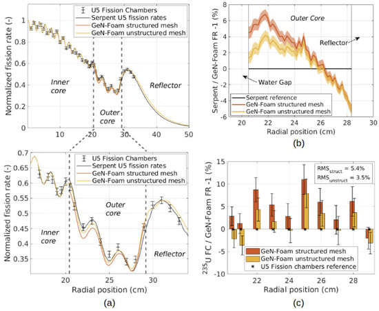On the zoom into the outer core region in Figure 6a, the unstructured GeN-Foam model appears to better match the Serpent reference solution. This is clearly represented in Figure 6b, where the two models, structured and unstructured, are compared to the Serpent solution. Error bars due to Serpent stochastic predictions appear directly on the C/E ratios, which explain the erratic changes observed from one mesh cell to the other. While both models show similar trends near the reflector, the unstructured mesh clearly helps in modeling the water gap and its near vicinity. For validation purposes, the GeN-Foam fission rate profiles obtained with both models were compared to the fission chamber measurements, as shown in Figure 6c. The unstructured mesh models the outer region of the core better, as demonstrated by a smaller RMS difference (see the upper right corner of the figure).