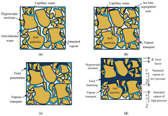 Figure 2. Soil sample structure at the different stages of freezing: (a) unfrozen equilibrium; (b) beginning of the freezing of ice lenses segregation; (c) further freezing or frost penetration; and (d) frost shattering and frost heave stage. - In Figure 2b, the sample is considered at the beginning of the freezing period, when the ice lenses’ cores have just started to segregate. The soil structure in the freezing fringe includes the moisture in three phases: the solid part—ice lenses; the liquid phase—hydroscopic; and the capillary water and the gas phase—saturated and unsaturated vapour.