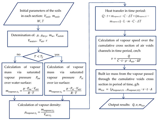An algorithm for determining mass transfer in a gaseous state is shown in Figure 4. Therefore, by knowing the volume and mass of the soil, and , as well as the humidity and temperatures T at the boundary points along the height, it is possible to determine the bulk and dry density of soil and the corresponding volumetric weight characteristics of each constituent: water , solid particles , air voids and porosity e.