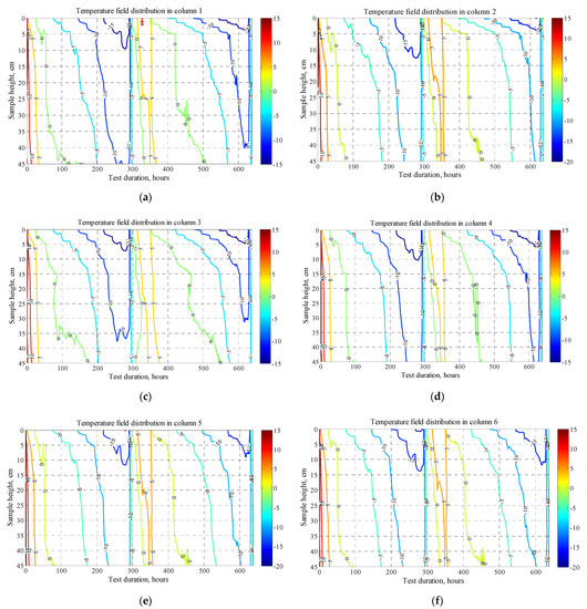 Temperature distribution along the x axis can be conditionally divided into: first, the consolidation zone; second, the freezing and thawing cycles (Figure 6). Temperature distribution over the sample length showed a cooling deceleration in the transition zone through zero degrees due to the latent heat of freezing. This is especially evident in large time intervals between 0 °C and −5 °C isotherms, which is explained by the specific heat of crystallization of water in the soil and requires much more energy than for its cooling. There is no clear pattern in the distribution of the temperature field inside samples with different densities. Slow freezing in this test gives enough time for phase transitions and uniform cooling and the density of the soil samples in this case does not affect the freezing rate. However, in loose density samples (Figure 6a–d), the isotherms in the first freezing cycle penetrate deeper than in the second, this is due to the large moisture content drawn upward in the second freezing cycle than in the initial state of the samples before testing. Due to the high heat capacity of water, a larger amount of heat removal is required to cool the samples.