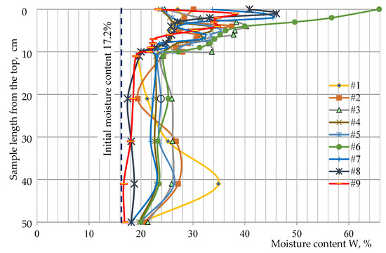 Moisture redistribution after freeze–thaw cycles in columns #1–#9.