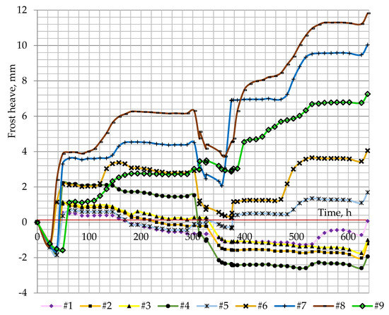 Two freeze–thaw cycles were performed with a slow freeze technique to provide sufficient time for moisture transport and phase transfer and thereby ensure the most favourable conditions for frost heaving [18,19]. The freezing rate was 2 °C/day; the setting temperature dropped up to −24 °C in the chilling collars. However, the minimum temperature in the topsoil layer was only −16 °C to −18 °C. Temperature changes in the sample sections were recorded by 96 thermocouples and recorded via Pica loggers over the entire period of the freeze–thaw cycles. Additional 3.5 kPa surcharges were placed on the soil surfaces, representing the weight of the pavement and evenly distributing the heat extraction over the surface of the sample. Solid plastic rods screwed to surcharges served to measure the vertical linear movements during the freeze–thaw cycles.