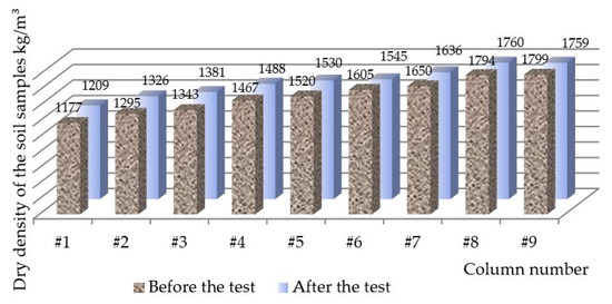 The dry density change in soil samples during two freeze–thaw cycles are presented in Figure 9. The columns with loose densities were consolidated throughout the column length with the densest part in the bottom of the samples. In comparison, in the dense soil samples only the 10 cm layer on top was loosened, which also attracted a large amount of water to form ice lenses.