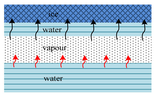 - In Figure 2d, all pores of the top layer are filled with ice and the suction in the vertical vein is still inducing the vapour mass transfer; the uneven filling of the soil layer induces a horizontal crack. This crack continues to fill with ice and lifts the soil layer in the only possible direction—upwards. As a result, the formed frost heaving is equal to ∆ (Figure 2d). The thickness of the horizontal crack increases until the overburden pressure equilibrates with cryosuction, after which the vapour mass continues to fill the lower layer pores (Figure 3).