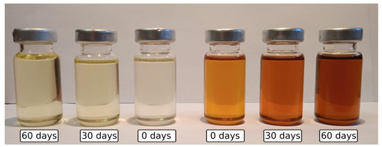 Throughout the tests, two vials, one of them filled with NE and the other one filled with NF, were removed from the oven after 3, 6, 11, 16, 23, 30, 39, 50, and 60 days of testing. Additionally, samples of both specimens not subjected to aging were fully characterized, with these results considered as “fingerprints”. The evolution of the two insulating fluids throughout the aging process can be seen in Figure 2. The coloration of the new NF samples was darker than that observed in the NE samples; this effect is due to the black color of the NP used in the experiment. The evolution of the colors as aging advanced was clear in both experiments. As can be seen, both types of fluids became darker due to the aging of the NE.