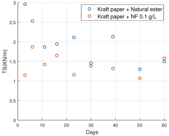 As a first conclusion of the present study, it was observed that the TS of kraft paper samples impregnated with NE and NF are very similar. The addition of NP does not affect the rate of loss of mechanical properties of the cellulose, regardless of whether the samples are fresh or aged.