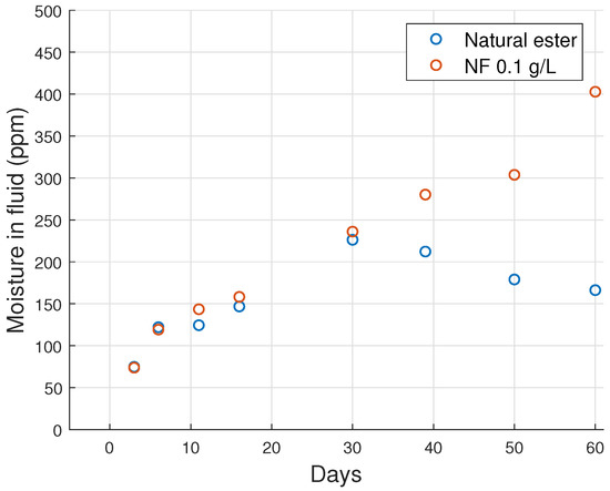 Figure 5 shows the evolution of the moisture content of the NE and the NF during the aging process. Those measurements were taken on samples of fluid extracted from the aging vials.