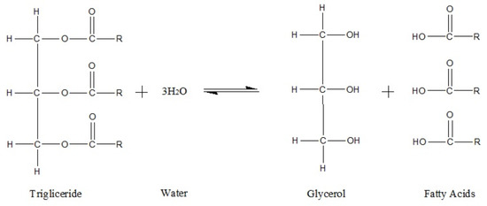 The reduction of the moisture in the NE was reported before [31]. It is produced by a chain of chemical reactions that take place when the NE begins to degrade as a result of the aging process. The process of degradation of the fatty acids takes place through a hydrolysis reaction (Figure 6), which consumes water molecules. Thus, as the experiment advanced, the tendency was for a reduction of the moisture content of the dielectric fluid.
