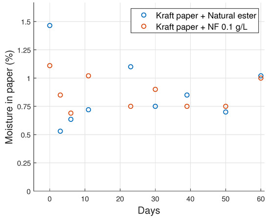 Figure 8 shows the results of the moisture tests on the aged paper samples as the experiment progressed. It is possible to see how moisture in the paper samples tended to stabilize at a value around 1% of RH. This final value is quite similar to the value at the beginning of the experiment. This effect, associated with the NE or NF moisture test, could reveal that dielectric fluid tends to accumulate most of the water molecules present in the system. This behavior has been observed previously by several authors [19,31].