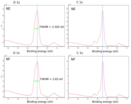 For a deeper analysis of the chemical reactions that take place in the different types of oil-paper insulation, an XPS analysis was carried out. Figure 9 shows the results of a high-resolution XPS spectroscopy performed on two kraft paper samples; the first sample was aged in presence of NE, and the second was aged in presence of NF. As can be observed, O1s and C1s peaks are shifted around 2–3 eV from the results found by other authors [33]. The reason for this is that the samples are made of non-conductive materials. Since this study compares the width of the peaks of both samples, the conclusions are not affected by the shift.