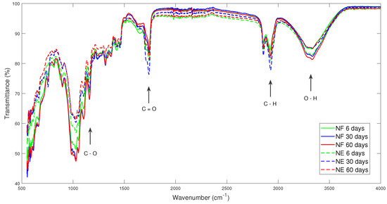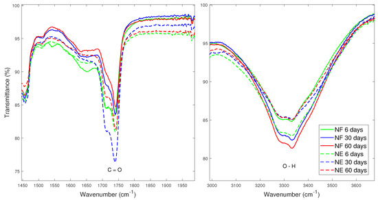 The band centered around 2800 cm represents the C-H functional groups. As can be seen, the transmittance of the NF-impregnated samples in this band decreased as the aging progressed; this fact is due to the products generated by the hydrolysis of the fatty acids [37]. For the NE-impregnated samples, the evolution was different; the transmittance rose after 30 days of aging and then, for samples of 60 days of aging, decreased to a value almost equal to that of the 6-day aging sample. This fact is consistent with the results of the moisture tests and with the mechanisms proposed in Figure 6 and Figure 7. As the transesterification progresses, it is more likely that water molecules and free fatty acids are consumed in the NE-impregnated samples.