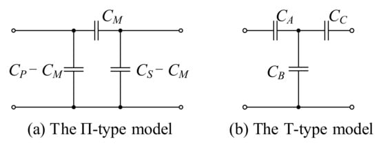 As shown in Figure 1a, the typical capacitive coupler is composed of four metal plates and it can be equivalent to a six-capacitor model where capacitors C12, C13, C14, C23, C24, C34 are formed by plates P1 and P2, P1 and P3, P1 and P4, P2 and P3, P2 and P4, P3 and P4 respectively. Furthermore, the six-capacitor model can be converted to a Π-type model where CP is the primary capacitor, CS is the secondary capacitor, and CM is the mutual capacitor, as shown in Figure 1b.