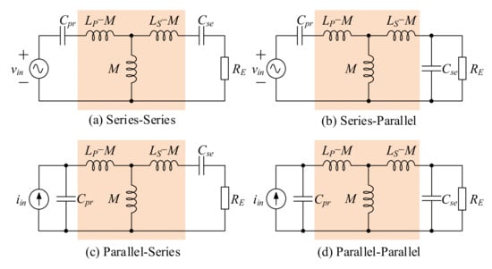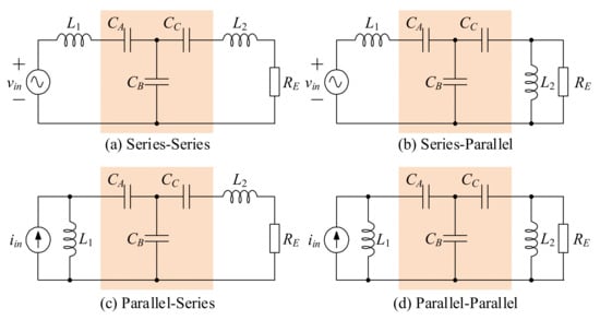 IPT has four basic compensation circuits, i.e., series-series (SS), series-parallel (SP), parallel-series (PS), and parallel-parallel (PP) as shown in Figure 3, where M is the mutual inductance, LP is the primary self-inductance, LS is the secondary self-inductance, Cpr is the primary compensation capacitor, and Cse is the secondary compensation capacitor. The SS and SP IPT circuits are powered by a high-frequency sinusoidal voltage source and the PS and PP IPT circuits are powered by a high-frequency sinusoidal current source. Taking the capacitive coupler and the external capacitors as a whole, CPT also has four basic compensation circuits as shown in Figure 4 where L1 and L2 are compensation inductors and the capacitive coupler is equivalent to a T-type model.