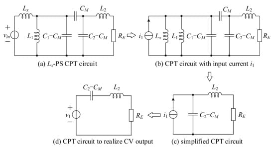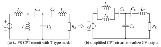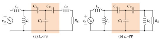 However, the CPT circuit with four compensation components cannot realize the input ZPA and CC/CV outputs to satisfy the charging demands of batteries. Thus, to prove a CPT circuit with five compensation components can achieve input ZPA and desired output, an additional inductor Lx is added into the PS and PP CPT circuits and these CPT circuits are powered by a high-frequency voltage source, as shown in Figure 5.