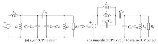 Similar with the Lx-PS CPT circuit, an additional inductor Lx is inserted between the voltage source and the primary side of a PP compensation circuit to form the Lx-PP CPT circuit as shown in Figure 10a. With Figure 10b, if CM resonates with (Lx‖L1‖C1 − CM), the input voltage vin can be converted to a load-independent voltage source vpp1. In this way, the CV angular frequency ωcv can be calculated as