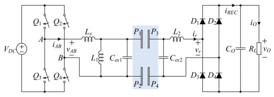 As analyzed in Section 2, the Lx-PS CPT circuit can satisfy the charging demands of batteries. The schematic of a Lx-PS CPT circuit is shown as Figure 15. The whole circuit is powered by a direct voltage VDC. The inverter uses a full-bridge inverter. The rectification uses a full-bridge rectifier and a filter capacitor. The voltage VDC is converted to a high-frequency square-wave voltage vAB by the inverter. The fundamental component of vAB is vin which is calculated as