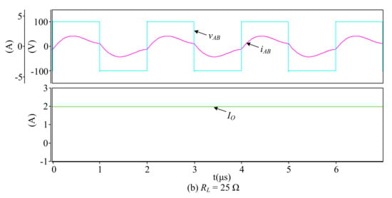 According to Figure 16, the output current keeps at 2 A when RL is equal to 12 Ω or 25 Ω, which means the CC output is successfully achieved. The input voltage vAB is in phase with the input current iAB, which means the input ZPA is achieved and most reactive power is eliminated.