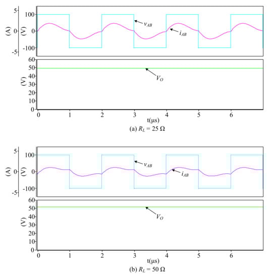 According to Figure 17, when the operating mode of the Lx-PS CPT circuit is transferred to CV mode, the output voltages at 25 Ω and 50 Ω are all 50 V. Similarly, the load-independent CV output is achieved and the input ZPA is guaranteed.