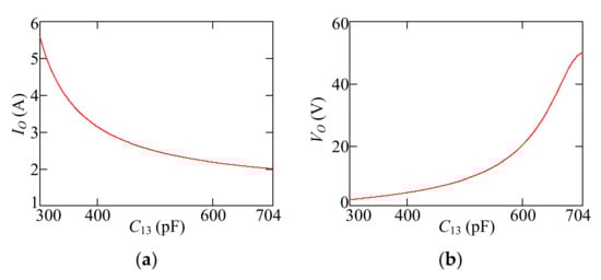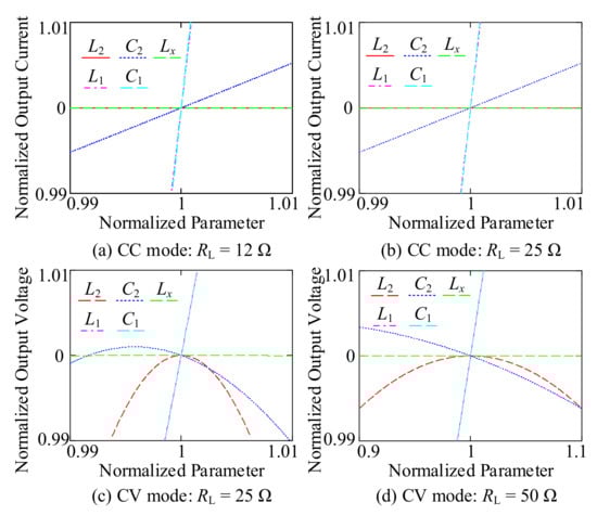 If the plate misalignment happens, the secondary plates of P3 and P4 may move in X-axis or Y-axis direction as shown in Figure 1a. Thus, capacitances C13, C24, C14, and C23 would change. Taking P3 and P4 moving in X-axis as an example, the cross-coupling capacitors C14 and C23 are still negligible. Similar with the aforementioned analysis, C13 and C24 decrease when the plate misalignment happens. Based on the CV operating frequency and compensation parameters shown in Table 1, the output current at CC mode would increase and the output voltage at CV mode would decrease.