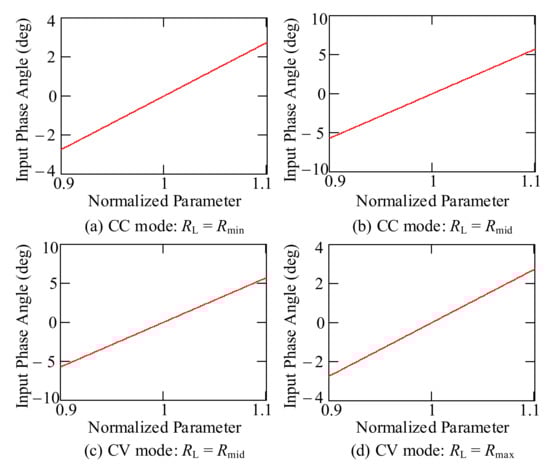 To permit ZVS of MOSFETs Q1,2,3,4, the input impedance should be slightly inductive in both CC and CV modes. Figure 20 shows the output current or voltage versus the different normalized parameters and load conditions for the two modes of operation. From Figure 20a,b in CC mode, the output current is not sensitive to the variation of L2 and Lx. From Figure 20c,d in CV mode, the output voltage is not sensitive to the variation of Lx. Thus, Lx is chosen to realize the ZVS of MOSFETs in the two modes of operation. Figure 21 shows the input phase angle versus normalized parameters at two charging modes and two loading conditions. A slight variation of Lx can permit a slight inductive phase angle for ZVS operation.