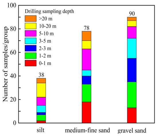 The soil specimens were sourced from the Qinghai–Tibet engineering corridor (Xidatan to Tanggula mountain section) and obtained by the drilling sampling method. Total number of sandy soil test specimens was 206, which included 38 groups of silt soil specimens, 78 groups of medium-fine sand specimens, and 90 groups of gravel sand specimens. Maximum sampling depth of the borehole was 40 m, and each drilling hole was sampled at different depths. The detail sampling depth distribution is shown in Figure 1.