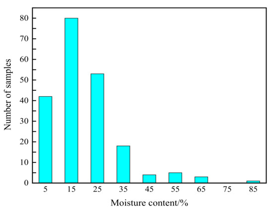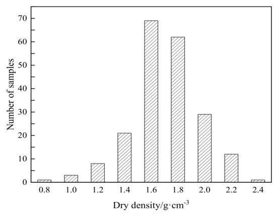 Table 1 shows the statistics of the physical parameters of the soil samples. It can be seen that the moisture content of the frozen–unfrozen sandy soil samples was 0.6~83%, and the dry density was 0.88~2.34 g·cm−3. As shown in Figure 2 and Figure 3, the distribution of moisture content and dry density of sand, respectively, are given. The samples with moisture content of 5%, 15%, and 25% were in the majority, and then decrease successively. Samples with moisture content of more than 20% accounted for about 40% of the total number of samples. The soil samples tested and reported on in this paper had a wide range of moisture content, including dry soil, saturated soil, and supersaturated soil. Meanwhile, it is noted that the dry density of the sandy soil samples tested was relatively high, with an average value of 1.71 g·cm−3. The dry density of the samples was mainly concentrated in the 1.6~2.0 g·cm−3 range, which accounted for 77.67% of the total number of samples. Correspondingly, only 16.02% and 6.31% of the samples had dry densities less than 1.6 g·cm−3 and greater than 2.0 g·cm−3.
