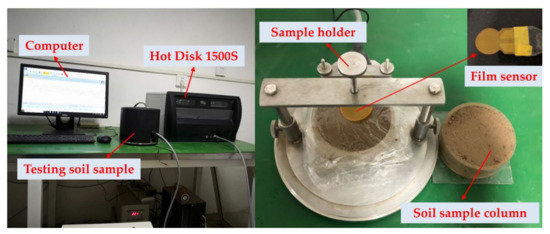 The TPS1500s Thermal Conductivity Analyzer (Hot Disk Co., Ltd., Uppsala, Sweden) was utilized as the experimental apparatus for determining the soil sample thermal conductivity (as shown in Figure 4), which had the advantages of analysis speed, unaffected by contact thermal resistance, and low requirements for test samples. The basic technical parameters of the Hot Disk1500 follow: thermal conductivity range: 0.005~500 W/(m·K); temperature range: 10~1000 K; test accuracy: ±3%; probe size: 2.0~29.4 mm.
