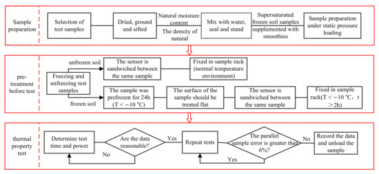 The natural density and moisture content of the soil samples were measured in situ and sealed for preservation. Then, the indoor remodeling test was carried out according to the geotechnical standard testing method, which mainly involved sample preparation, pre-treatment before the test, and the thermal property test (as shown in Figure 5). Samples in which the natural moisture content was below saturated moisture content were prepared by directly mixing water to make unfrozen soil samples. Saturated or supersaturated soil samples were made into frozen soil samples by adding smoothies to the unfrozen soil sample. Furthermore, in order to improve test accuracy, samples larger than 80 mm in diameter and 30 mm in height were fabricated using sampler and hydraulic press demudding, and circular Kapton probe with diameter of 29.4 mm was applied in the test. The Kapton probe was clamped in a flat sample room and fixed in a sample rack. The unfrozen sample was tested at room temperature, while the frozen soil sample was tested in a more complicated process, which required pre-freezing, leveling, and constant negative temperature experimental procedures.