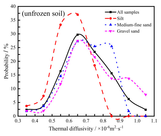 The probability distribution of thermal diffusivity of frozen and unfrozen soil with different particle sizes is given in Figure 6 and Figure 7. It can be seen that the distribution characteristics of frozen and unfrozen soils are similar. The main distribution interval of thermal diffusivity is distributed in the order of silt, medium-fine sand, and gravel sand, while the corresponding main distribution interval values increase sequentially. In order to facilitate comparison and analysis, the average thermal diffusivity coefficients of the frozen and unfrozen soils of various sandy soils are calculated. The average thermal diffusivity coefficients of silty sand, medium-fine sand, and gravel sand unfrozen soil were 0.615 × 10−6, 0.706 × 10−6, and 0.746 × 10−6 m2/s, respectively. The average values of the thermal diffusivity of frozen soil were 1.117 × 10−6, 1.220 × 10−6, and 1.222 × 10−6 m2/s, respectively. It can be shown that the thermal diffusivity of sandy soil is positively correlated with the particle size. With the increase of sand size, thermal diffusivity of sandy soil increases significantly.