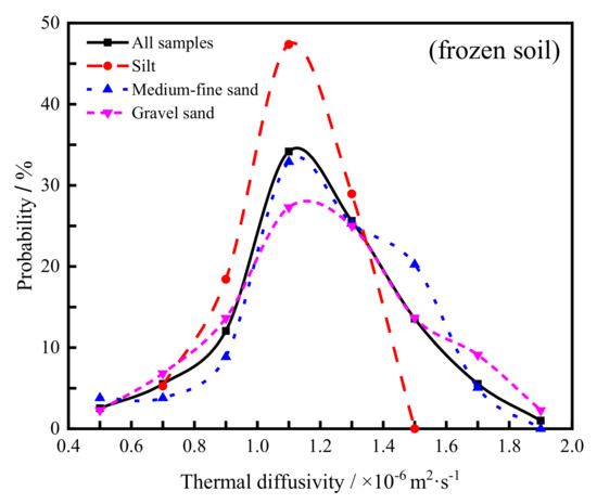 Probability distribution of thermal diffusivity of frozen soil with different particle sizes.