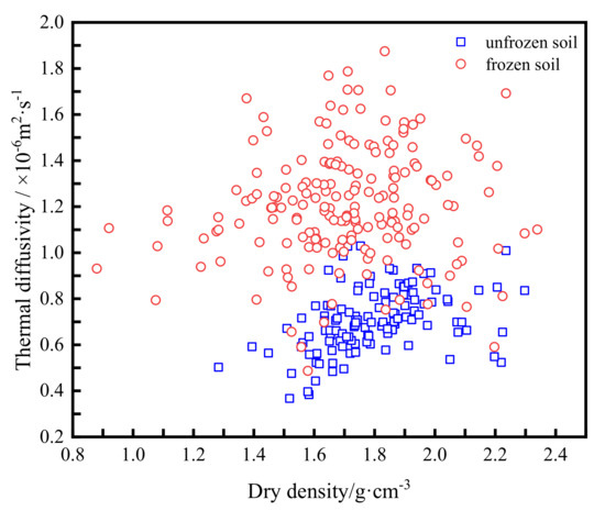 In addition, statistics were analyzed for the main distribution intervals of the thermal diffusivity of the frozen–unfrozen sandy soil. To eliminate sampling random errors and calculation errors, the cumulative distribution probability 20~80% interval statistics indicate that the thermal diffusivity of unfrozen soil is 0.577 × 10−6~0.826 × 10−6 m2/s, and the thermal diffusivity of frozen soil is 0.999 × 10−6~1.402 × 10−6 m2/s. Figure 8 and Figure 9, respectively, show the distribution relationship between thermal diffusivity and dry density and the moisture content of frozen and unfrozen soil samples. It can be seen that the corresponding distribution characteristic of thermal diffusivity under different dry density and moisture content is generally discrete and random in a natural state. There is no obvious linear relationship between thermal diffusivity and dry density or moisture content. As mentioned above, this is because the thermal diffusivity of frozen soil is determined by the characteristics of many factors (e.g., mineral skeleton composition, particle size, geothermal, depth, dry density, and moisture content).