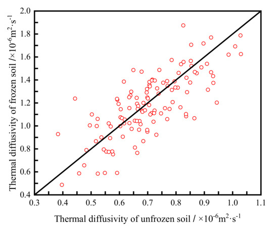 Figure 10 exhibits the distribution relationship for the thermal diffusive coefficient of frozen and unfrozen soil. It can be seen that the thermal diffusive coefficient of frozen soil has a wider distribution range, concentrating in the range 0.8 × 10−6~1.6 × 10−6 m2·s−1, while the thermal diffusive coefficient of unfrozen soil is concentrated in the range of 0.6 × 10−6~0.9 × 10−6 m2·s−1. Additionally, the thermal diffusivity of frozen soil has a significant linear relationship with the thermal diffusivity of unfrozen soil.