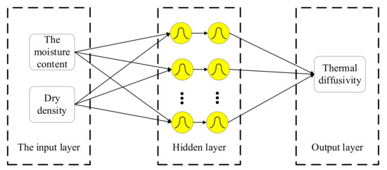 RBF neural network is a three-layer pre-feedback neural network, which has the characteristics of strong local approximation ability, fast learning convergence speed, small calculation amount, and strong generalization ability. The strong nonlinear approximation ability of RBF neural network has a wide range of applications in many fields [23,24]. JMP V13.2.0 Pro software was used to take moisture content, dry density, and unfrozen sample thermal diffusivity (ternary model) as the input layer of the RBF neural network, and the pre-feedback model was established. The model uses a Gaussian function as the hidden layer activation function and the hidden layer is set to 2 layers with 12 nodes in each layer (as shown in Figure 11).