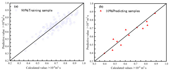 RBF neural network prediction results of thermal diffusivity of unfrozen soil: (a) training samples and (b) prediction samples.