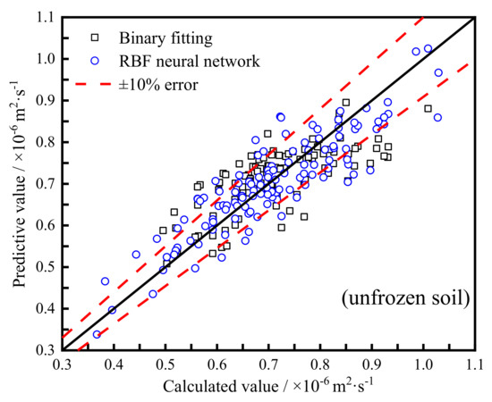 The prediction results of the binary fitting model and RBF neural network prediction model of unfrozen soil were calculated, as shown in Figure 13. It is noted that most of the predictive points are distributed within ±10% relative error range. The proportion of predictive points for the binary fitting model within the ±10% error range is 65.69%, while the proportion of predictive points for the RBF neural network model within the ±10% error range is 75.41%. The predicted values obtained by the two prediction models are in general agreement with the calculated values, which proves the effectiveness and engineering application value of the two prediction models. In addition, by comparing the two prediction methods, it clearly shows that the prediction effect of the RBF neural network model is better, which has about 10% more predictive points within the ±10% error range and has more predictive points at both ends of the thermal diffusivity distribution range.