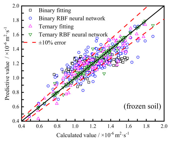 The prediction effect of the four prediction models for frozen soil was calculated and compared; the results are shown in Figure 14. Generally, the four models all have good prediction performance. The determination coefficient (R2) of the binary fitting, binary RBF neural network, ternary fitting, and ternary RBF neural network prediction methods is 0.26, 0.69, 0.86, and 0.97, respectively. Additionally, the proportion of predictive points within the error range of ±10% are 52.50%, 57.75%, 74.14%, and 95%, respectively, indicating that the prediction accuracy of the four prediction models improved successively. However, by comparing the number of predictive points within ±10% error range and the differences between the calculated values and the predictive values, it can be found that, by using the unfrozen soil thermal diffusivity as a regression parameter, the ternary fitting method has higher accuracy than the binary prediction method (only using ω and ). Moreover, the prediction effect of the RBF neural network method is obviously better than that of the polynomial fitting method, especially for both ends of the interval.