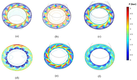 Pressure contours for different rotational speeds: (a) N = 750 rpm; (b) N = 1050 rpm; (c) N = 1500 rpm; (d) N = 1600 rpm; (e) N = 1800 rpm; (f) N = 1850 rpm.