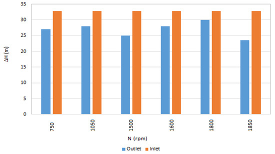 Figure 4 shows the total pressure drop at the inlet and outlet rotor for different rotational speeds. According to this figure, such a difference in terms of pressure drop is quite small for most rotational speeds. Instead, a more significant difference is detected for a rotational speed equal to 1850 rpm.