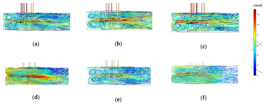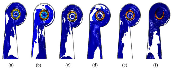 Velocity streamlines near the impeller for different rotational speeds: (a) N = 750 rpm; (b) N = 1050 rpm; (c) N = 1500 rpm; (d) N = 1600; (e) N = 1800 rpm; (f) N = 1850 rpm.