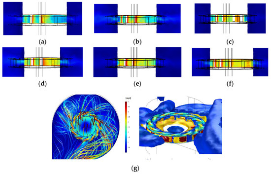 Velocity magnitude for H = 32.8m and different rotational speeds: (a) N = 750 rpm; (b) N = 1050 rpm; (c) N = 1500 rpm; (d) N = 1600; (e) N = 1800 rpm; (f) N = 1850 rpm; (g) general horizontal plan view.