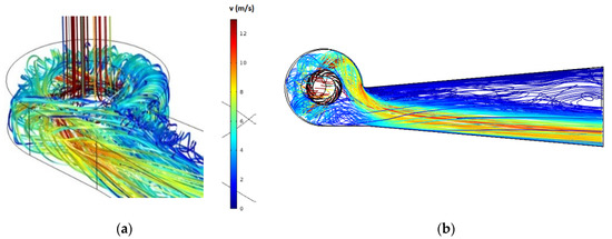 Figure 8 presents the velocity streamlines between the runner and the guide vane. According to the streamline trend, it is clear that the fluid moves radially outward in the rotor boundary layer. With reference to Figure 9, the velocity contour shows that the maximum velocity reaches about 12 m/s in the region close to the leading edge of the rotating blade, whereas the minimum velocity occurs close to the right side of the vane.