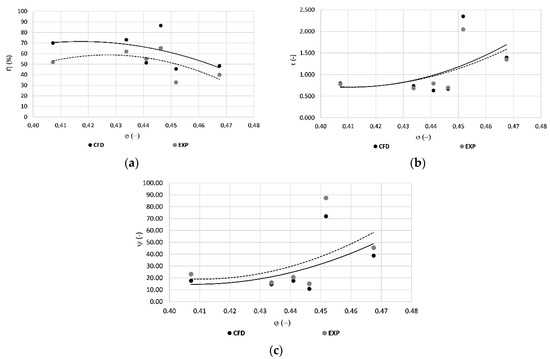 Comparison between experimental measurements and numerical results. (a) Efficiency vs. flow rate coefficient; (b) torque coefficient vs. flow rate coefficient; (c) head coefficient vs flow rate coefficient.