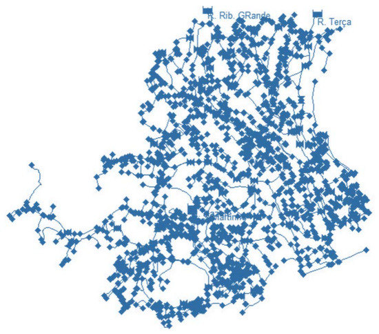 Once the design and performance of the novel turbine were investigated by experiments and CFD analyses, an application to a real case study network was then considered. The case study concerns the water distribution network supplying Funchal city in the Madeira region (PT) (Figure 11). Such a network consists of a number of links (l) and nodes () as 2844 and 2801, respectively, and it is supplied by five reservoirs, whose water levels were assumed as constant. The total flowrate supplied by the reservoirs is 300 L/s. Out of five reservoirs, two are located at 360 and 400 m.a.s.l., whereas the elevation of the remaining three reservoirs is approximately 250 m.a.s.l. The network layout is presented in Figure 11. According to the current configuration of the network, several pressure reducing valves (PRVs) and throttle control valves (TCVs) are installed with the aim of controlling the pressure in the whole network. Moreover, further valves are present in order to close some links and determine a kind of district area of the network.