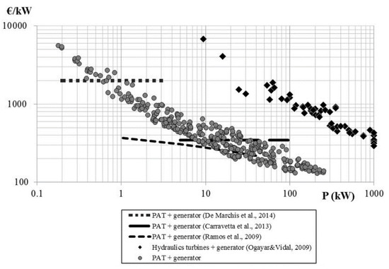 - Novara, D.; Carravetta, A.; McNabola, A.; Ramos, H.M. Cost Model for Pumps as Turbines in Run-of-River and In-Pipe Microhydropower Applications. J. Water Resour. Plan. Manag. 2019, 145, 04019012. [Google Scholar] [CrossRef]