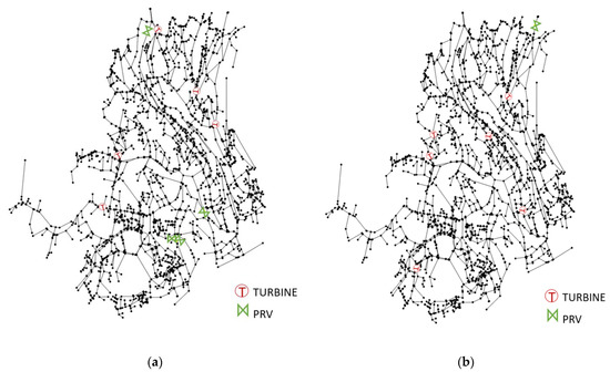 - Morani, M.C.; Carravetta, A.; D’ambrosio, C.; Fecarotta, O. A new mixed integer non-linear programming model for optimal PAT and PRV location in water distribution networks. Urban Water J. 2021, 18, 394–409. [Google Scholar] [CrossRef]