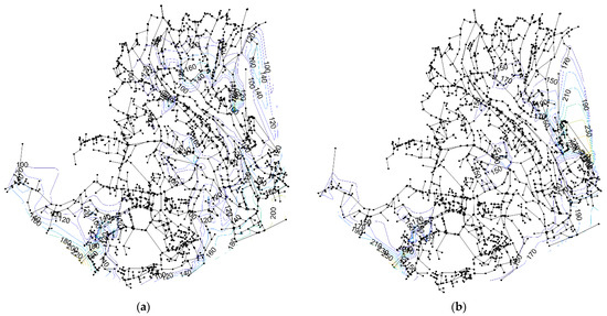 The water unit cost was fixed as 0.3 €/m3, as representative of the analyzed case study area. According to the formulation proposed by Araujo et al. (2006) [55], the total leaked discharge in the network can be evaluated as the sum of the discharge leaked in all single nodes:
