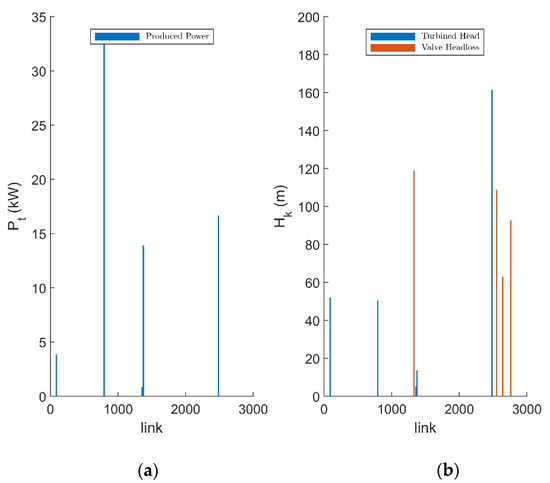 Produced power of the installed turbines (a) and head drop within the devices (b) resulting from case (II).